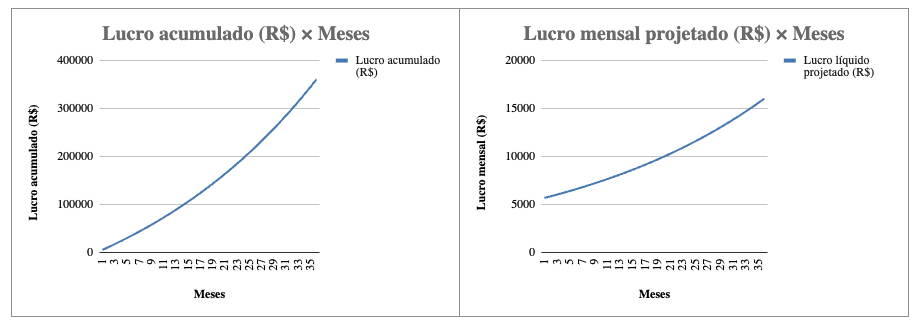 Visualize a evolução do lucro mês a mês e o momento exato em que seu investimento se paga.